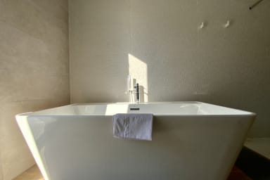 The house has two bathrooms: one with a bathtub and shower, and the other with a shower and toilet for the independent suite. A separate toilet is also available.
