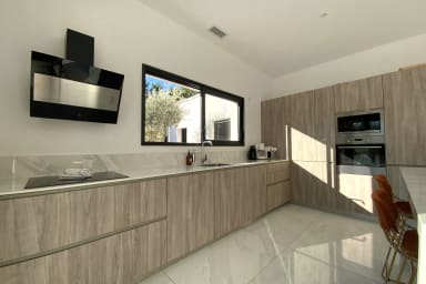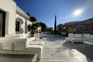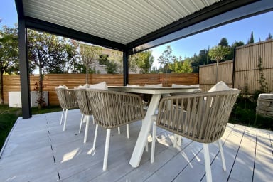 The exterior is a true place of relaxation. The large wooden terrace offers several areas to fully enjoy the southern sun: a summer lounge, poolside deck chairs, a large dining table, and a gas grill for al fresco dining. All in a quiet and intimate setting, with no overlooked views.