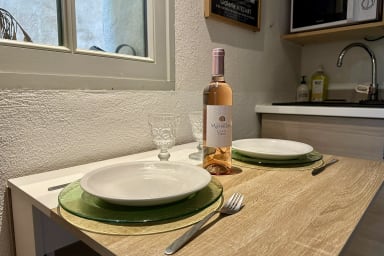 - D'un espace repas situé côté cuisine, avec une table d'appoint et ses chaises.